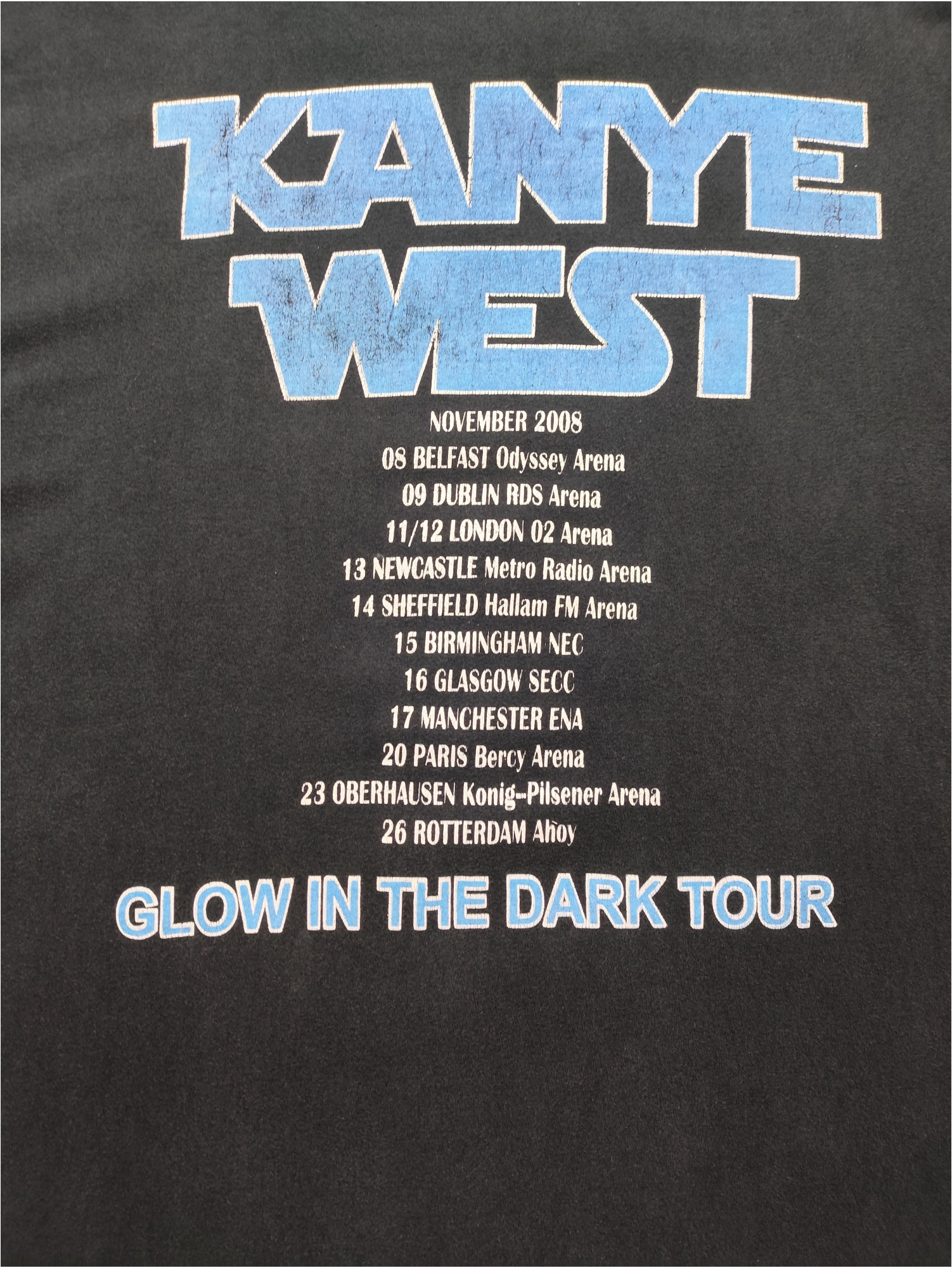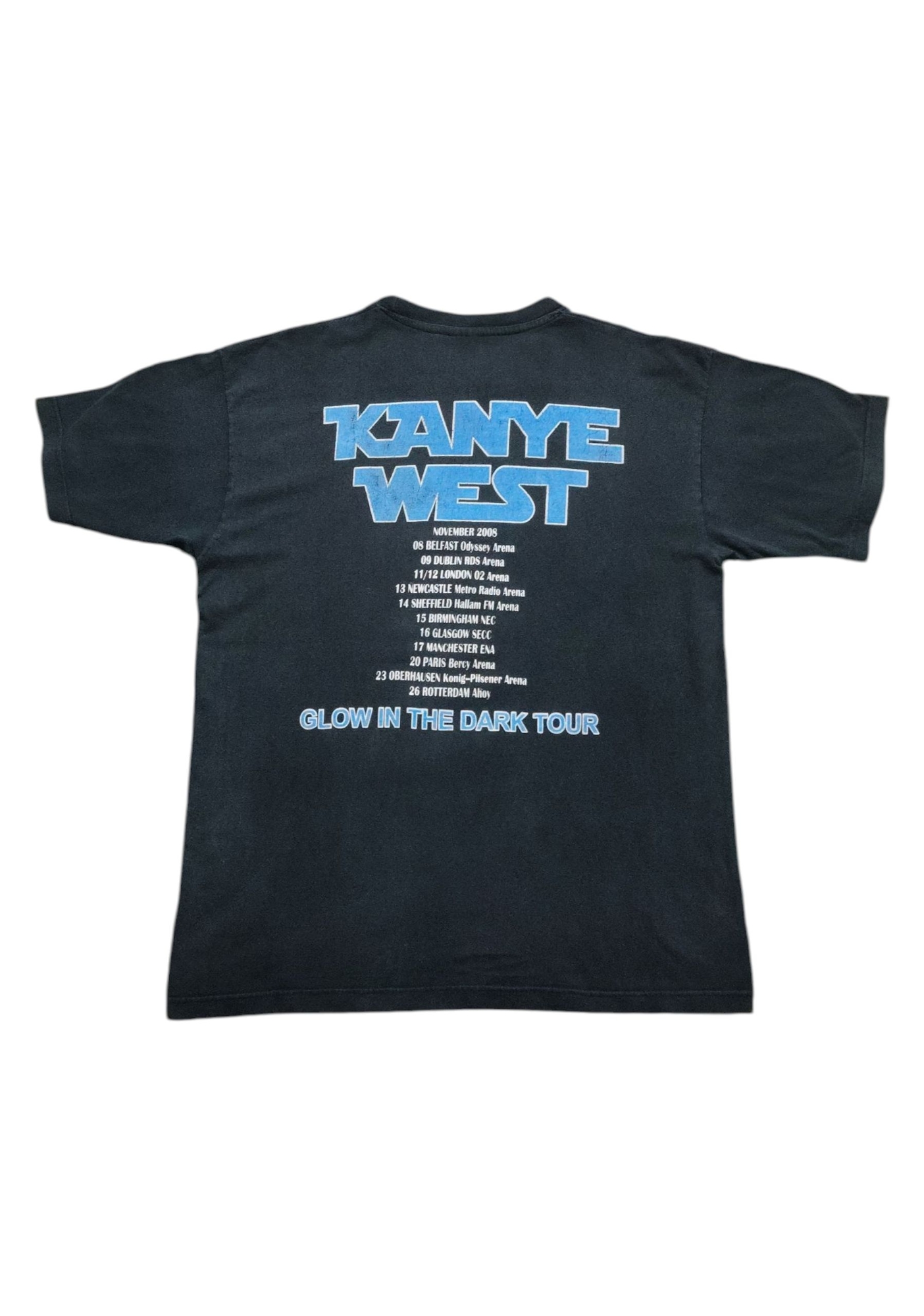 The Kanye West “Glow In The Dark Tour,” which this T-shirt commemorates, was a groundbreaking and highly ambitious concert tour that ran from late 2007 into 2008. Designed by Kanye West and a team including set designer Es Devlin and lighting designer Martin Phillips, it was widely hailed as a revolutionary live music experience, moving beyond traditional hip-hop concerts to incorporate elaborate theatrical elements. The show featured a complex narrative centered around West as an astronaut stranded on a distant planet, complete with stunning visuals, intricate lighting, and a minimalist stage that transformed throughout the performance. The tour supported his critically acclaimed album Graduation (2007) and pushed the boundaries of what a hip-hop concert could be, influencing countless artists who followed and solidifying West’s reputation as a visionary artist who merged music with high-concept art and fashion.