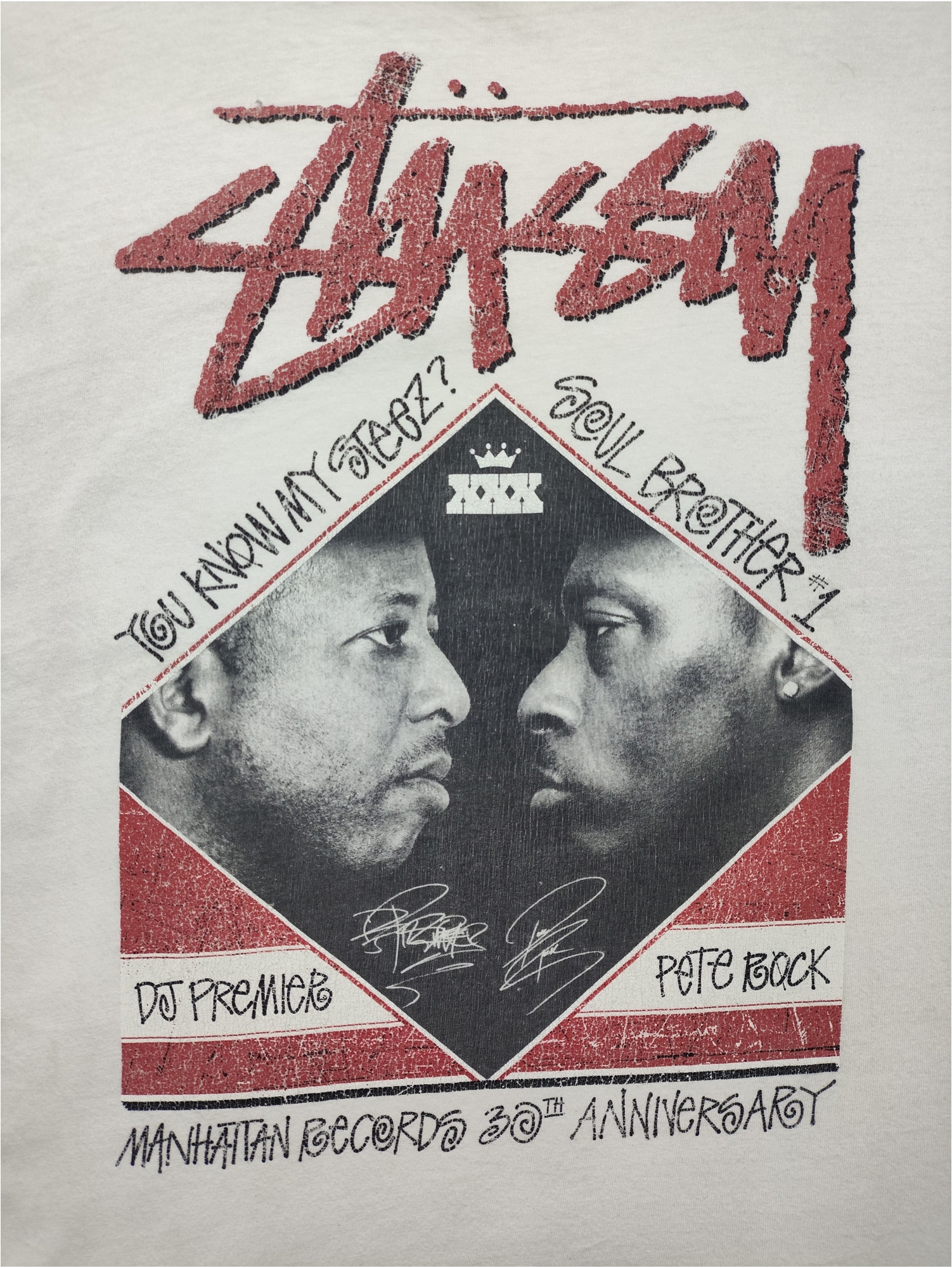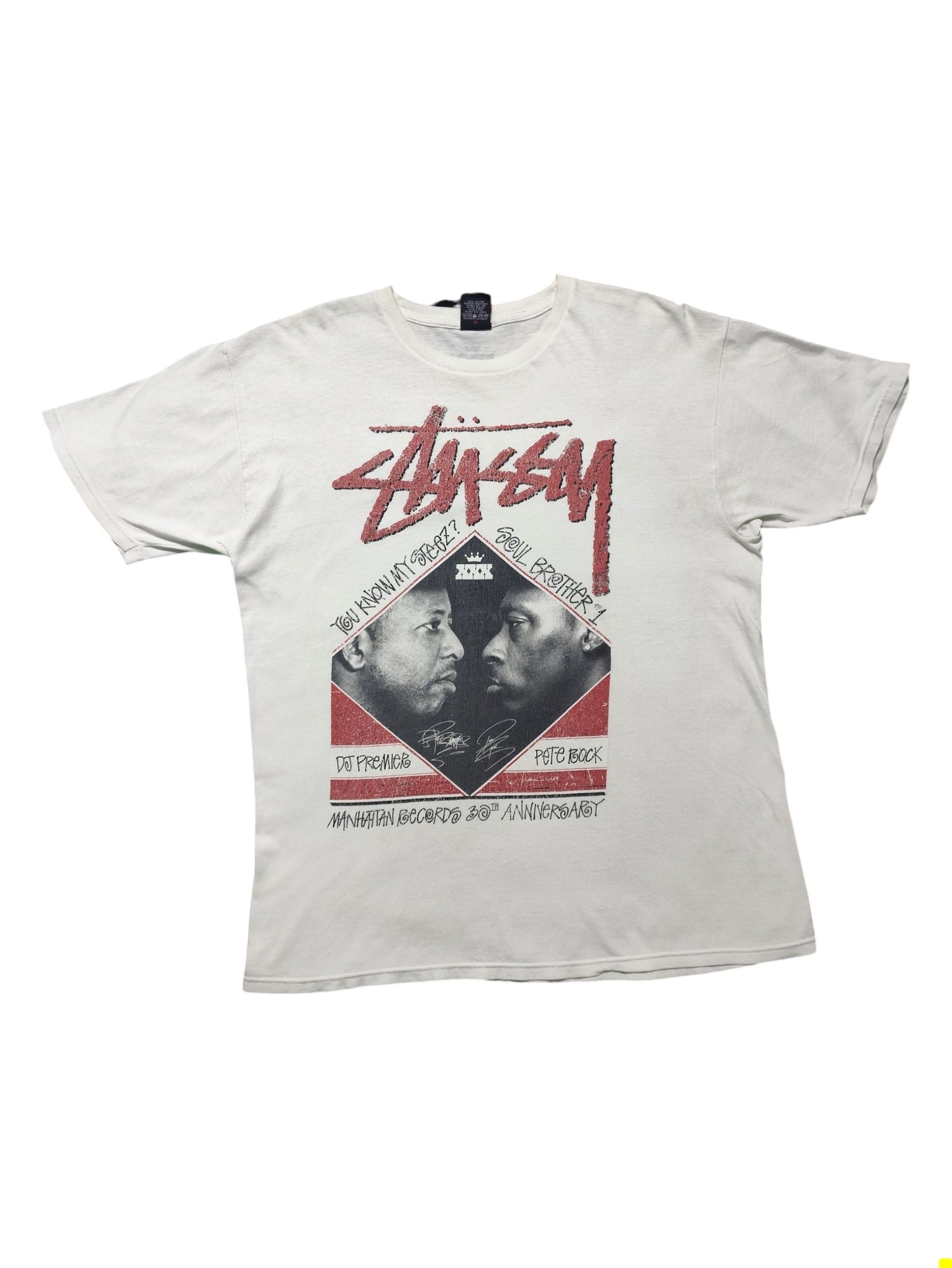 This Stüssy photo tee celebrates a significant collaboration that brought together two of hip-hop’s most revered producers and DJs: DJ Premier and Pete Rock. The shirt likely commemorates the “Manhattan Records 30th Anniversary” event, specifically a legendary DJ battle between Premier and Pete Rock that took place in Japan around 2010. This collaboration highlights Stüssy’s deep roots and influence within music culture, particularly hip-hop, by paying homage to these iconic figures whose innovative production techniques and distinctive sounds defined eras of the genre. The shirt itself, featuring their likenesses, serves as a tribute to their impact on music and solidifies the connection between streetwear and the golden age of hip-hop.