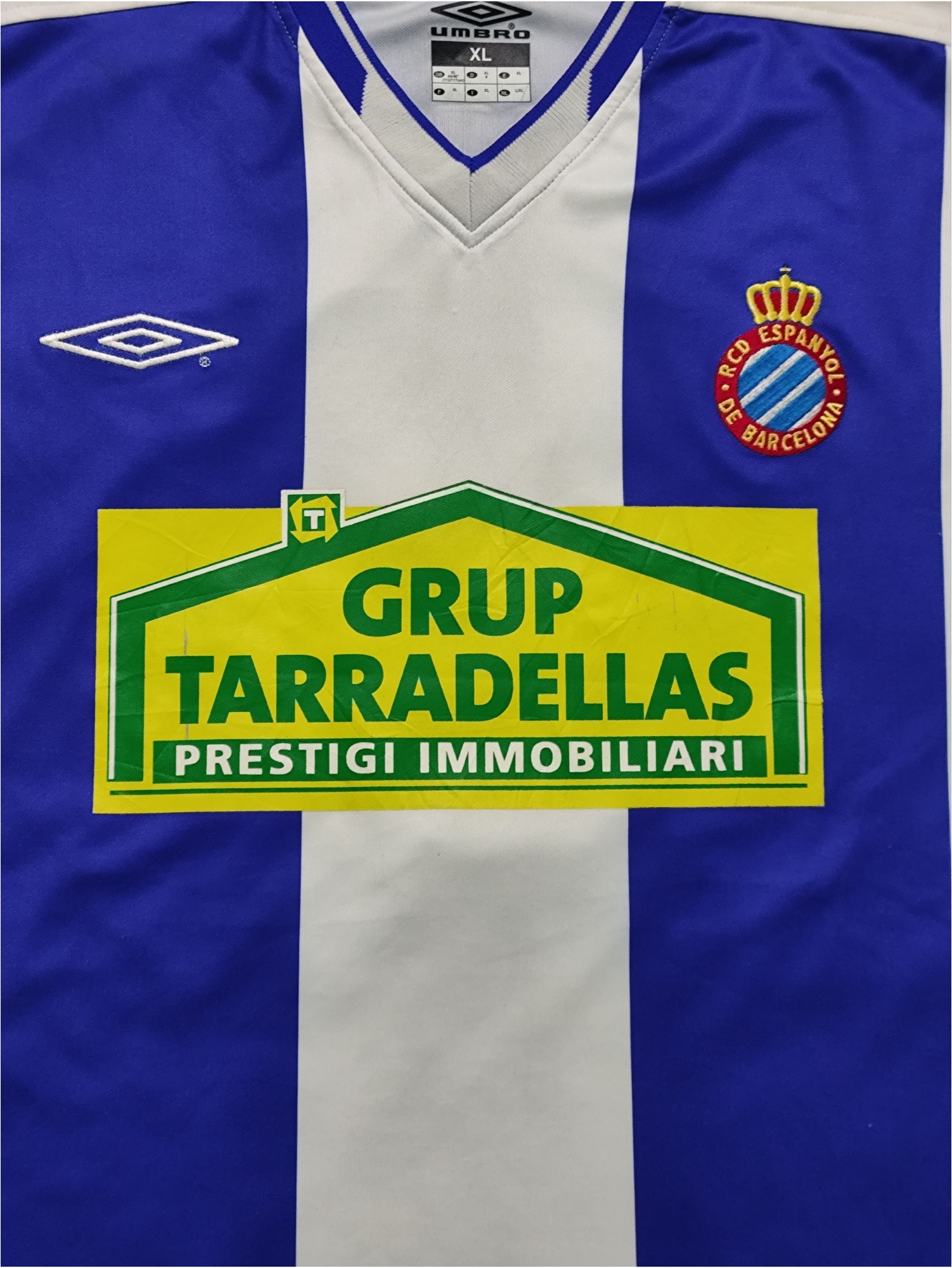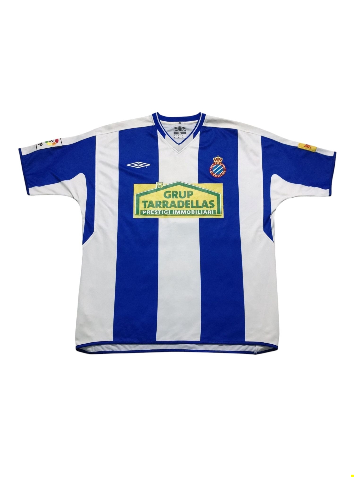 This Umbro Espanyol home jersey from the 2004-05 season, featuring Toni Velamazán’s number 7, signifies a surprisingly successful period for the Catalan club under coach Miguel Ángel Lotina. After several seasons battling relegation, Espanyol defied expectations to finish an impressive fifth in La Liga, securing qualification for the UEFA Cup for the first time in nine years. Velamazán, a consistent presence in midfield, contributed to a solid team effort that saw them achieve their highest league finish in over a decade. This classic blue and white striped kit, with the “Grup Tarradellas” sponsor, became a symbol of a season where the team’s strong defensive organization and opportunistic attack helped them upset bigger clubs and earn a well-deserved European spot.