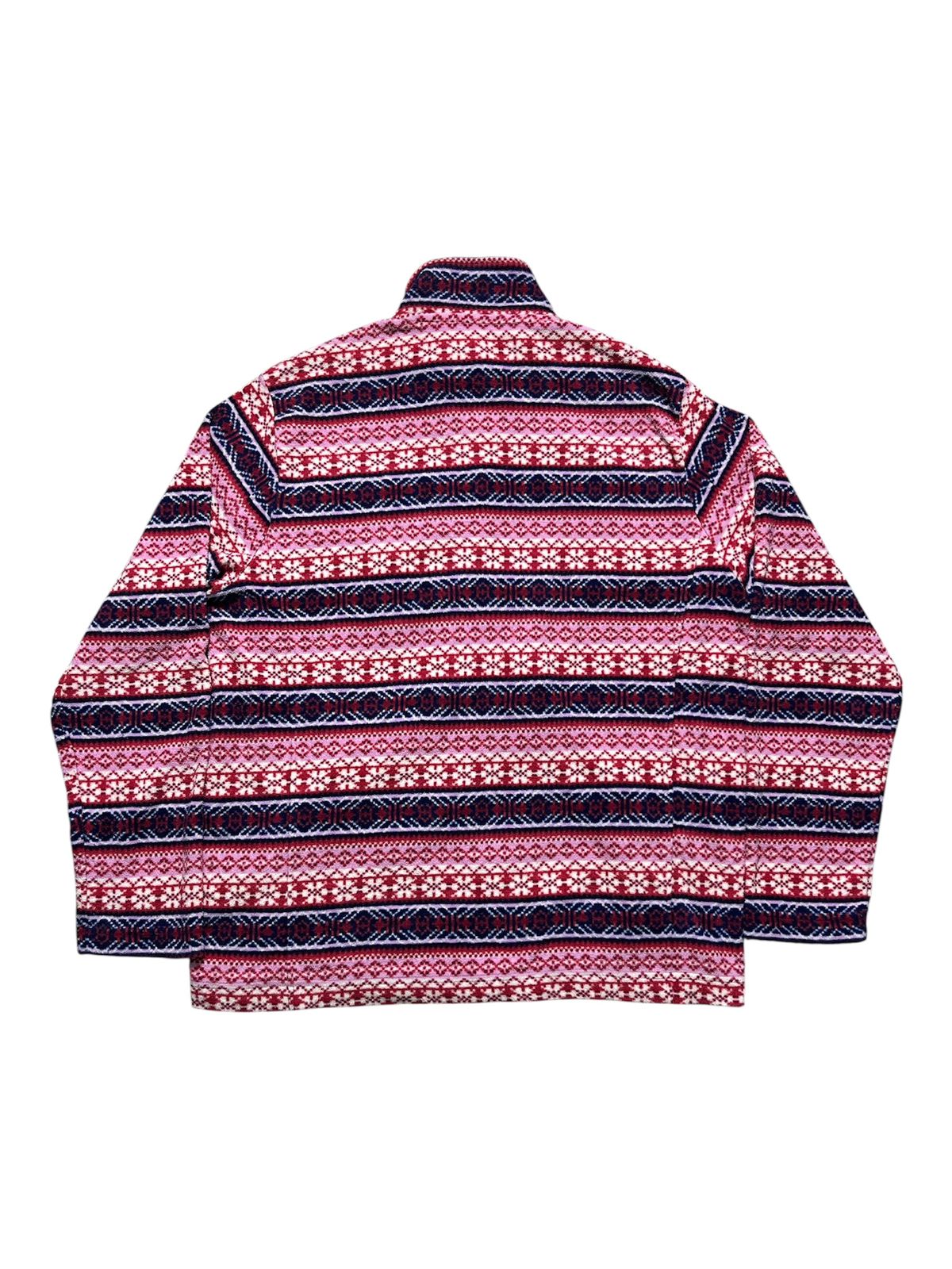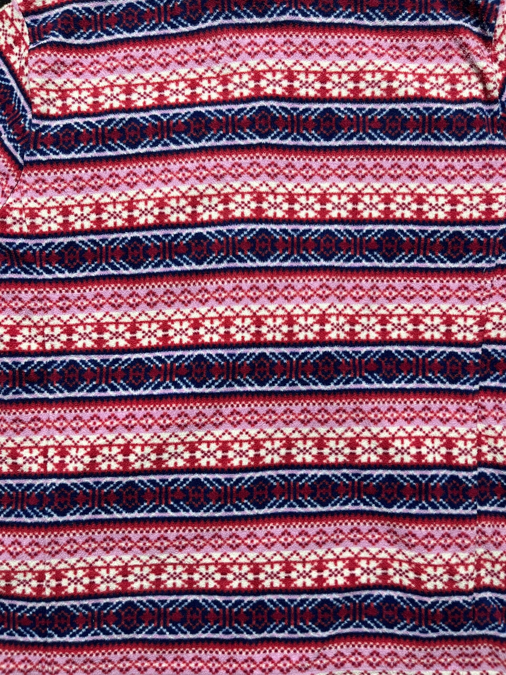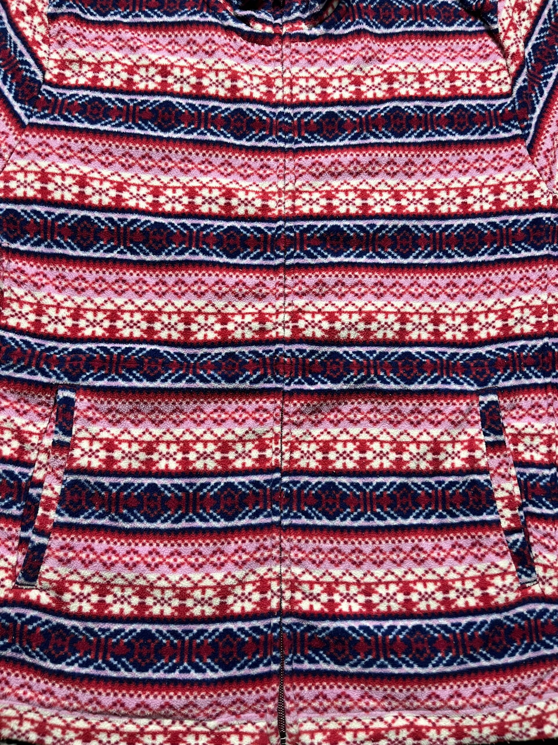 The unbranded Navajo-style jacket is a quintessential piece of fashion that reflects a popular trend from the late 20th century, particularly the 1980s and 1990s, when Southwestern and indigenous-inspired designs were widely adopted in mainstream apparel. This jacket’s all-over geometric pattern, featuring a blend of pink, red, blue, and white hues, mimics the traditional weaving and textile patterns of the Navajo and other Southwestern Native American tribes. While it is an unbranded item and therefore not an authentic piece of indigenous craftsmanship, its popularity stems from the broader cultural fascination with the American West and its distinct artistic traditions. The fleece material and full-zip design make it a practical and comfortable garment, and its vibrant pattern makes it a bold fashion statement. Today, these jackets are considered vintage items, symbolizing an era of fashion that borrowed heavily from cultural motifs to create a casual, bohemian, and visually striking aesthetic.