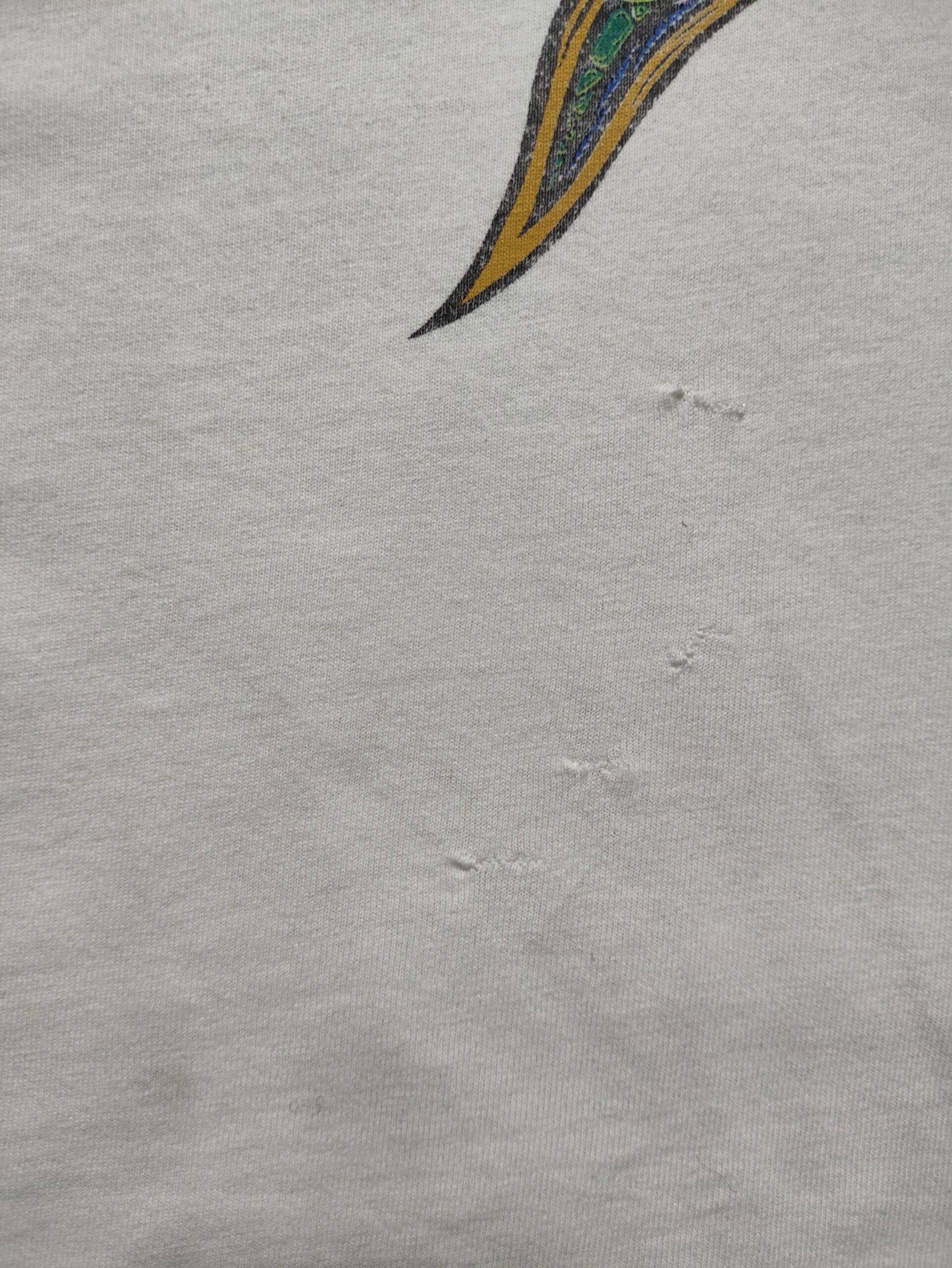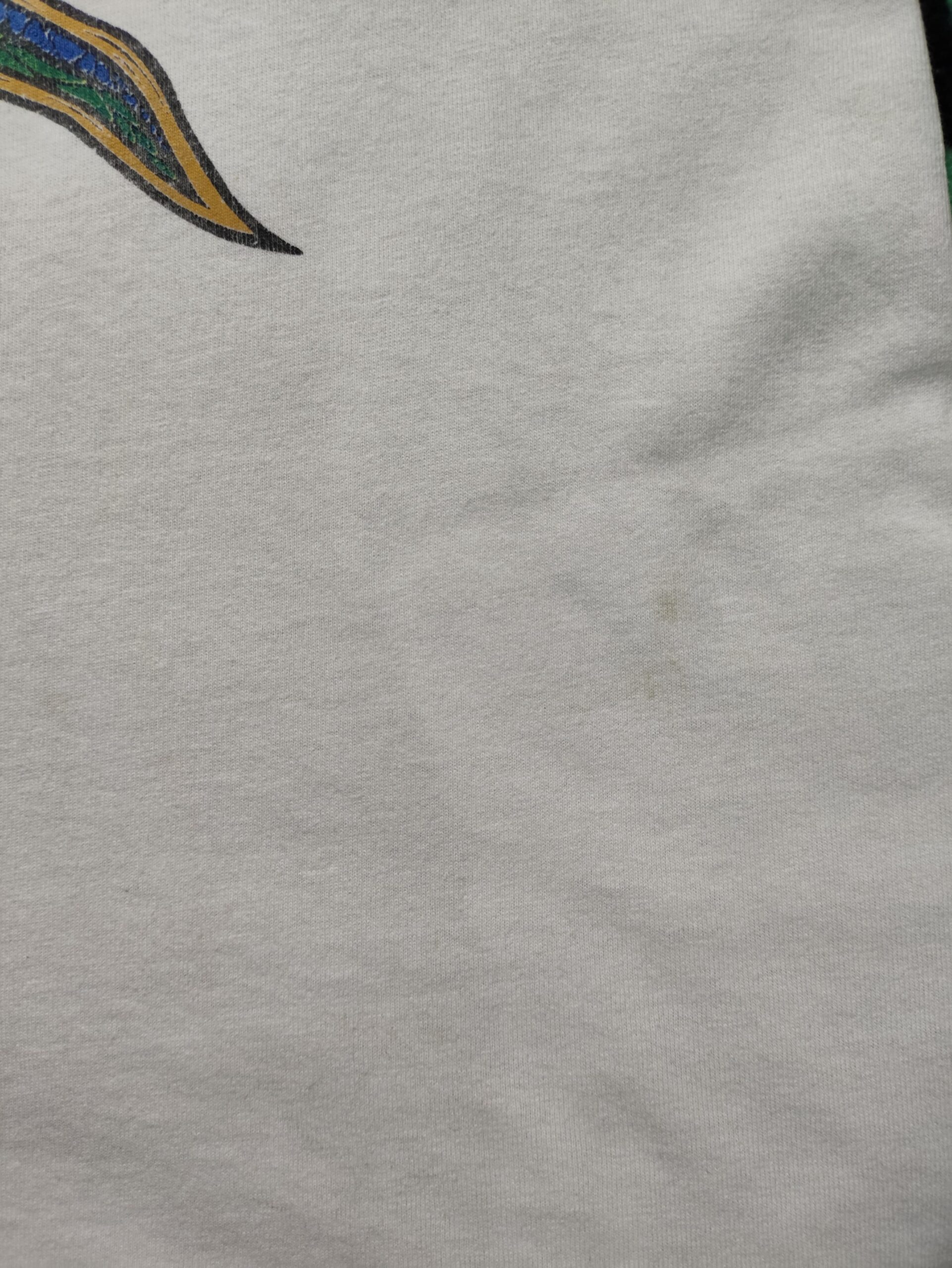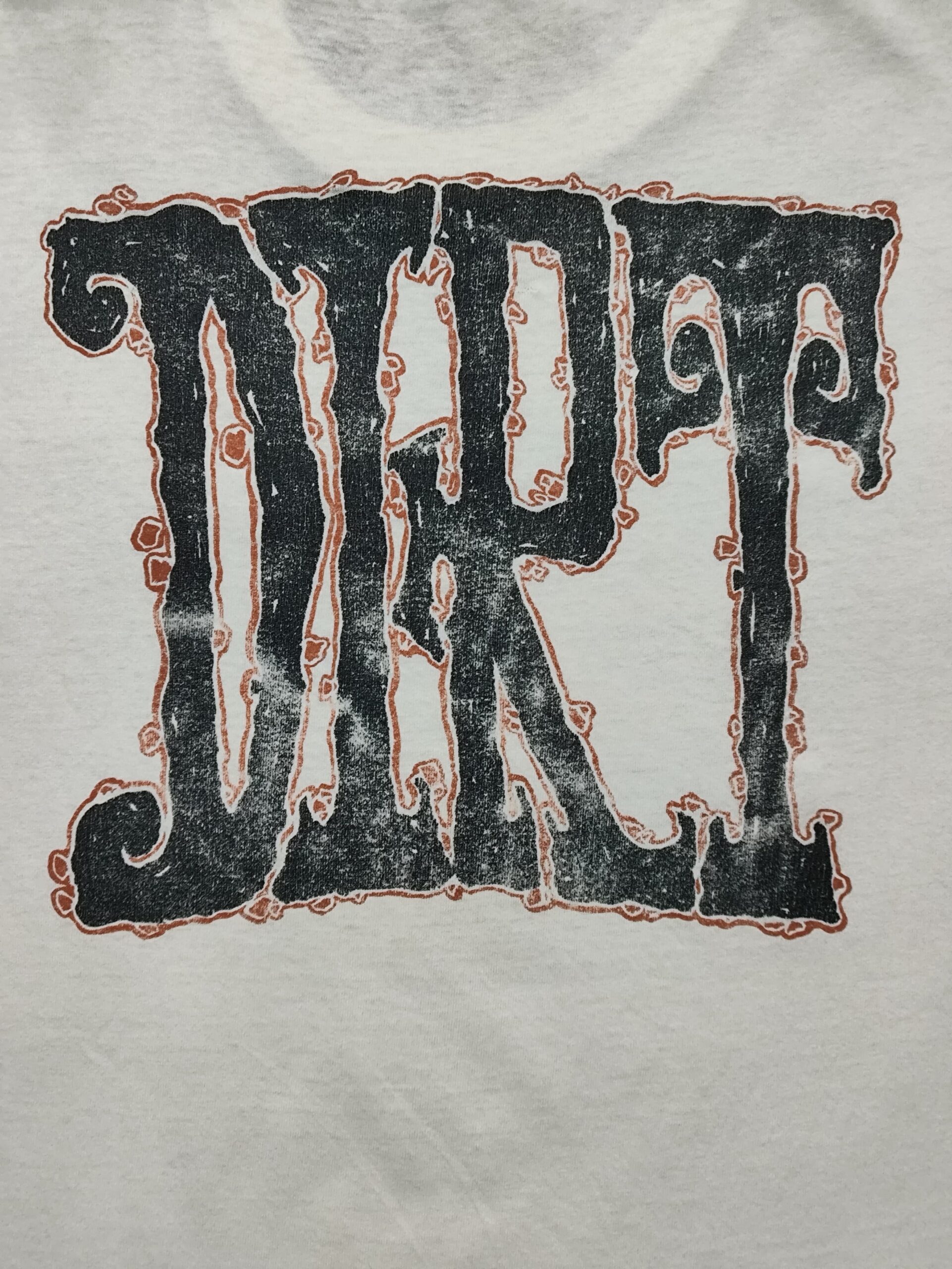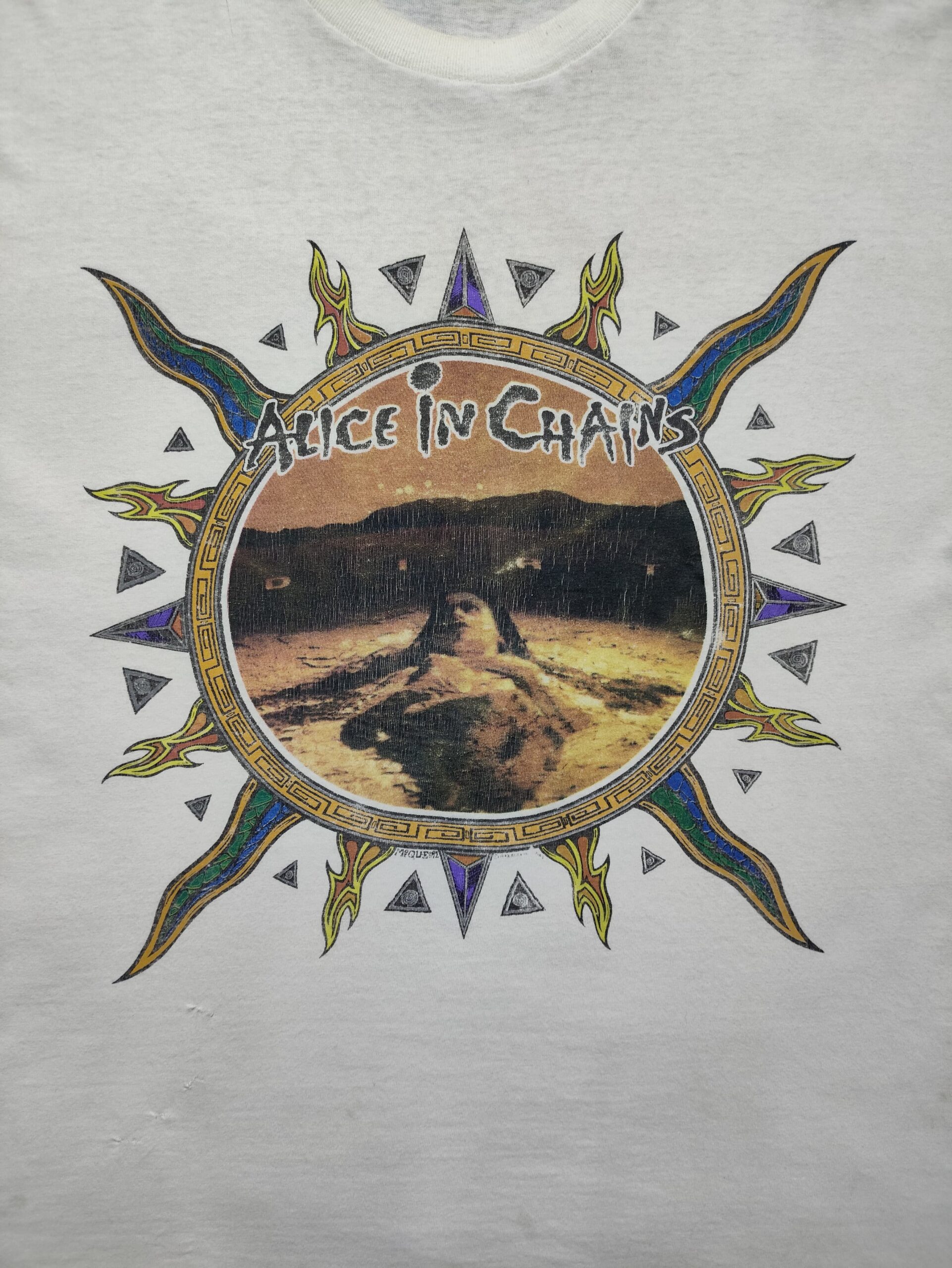This vintage 90s Alice in Chains T-shirt is a powerful piece of grunge history, commemorating their second studio album, “Dirt,” released in 1992. The front of the shirt features a graphic inspired by the album’s cover art, which depicts a woman buried in a desert landscape, a stark visual representation of the album’s bleak and introspective themes of addiction, depression, and death. The band’s name is incorporated into a sun-like design, reflecting the album’s raw, heavy sound and its roots in the Seattle grunge scene. The back of the shirt features the album title, “DIRT,” in a stylized, jagged font that further emphasizes the album’s dark and gritty aesthetic. This T-shirt is not just a piece of merchandise but a symbolic representation of a masterpiece album that is considered a cornerstone of the grunge movement and a timeless work of art.