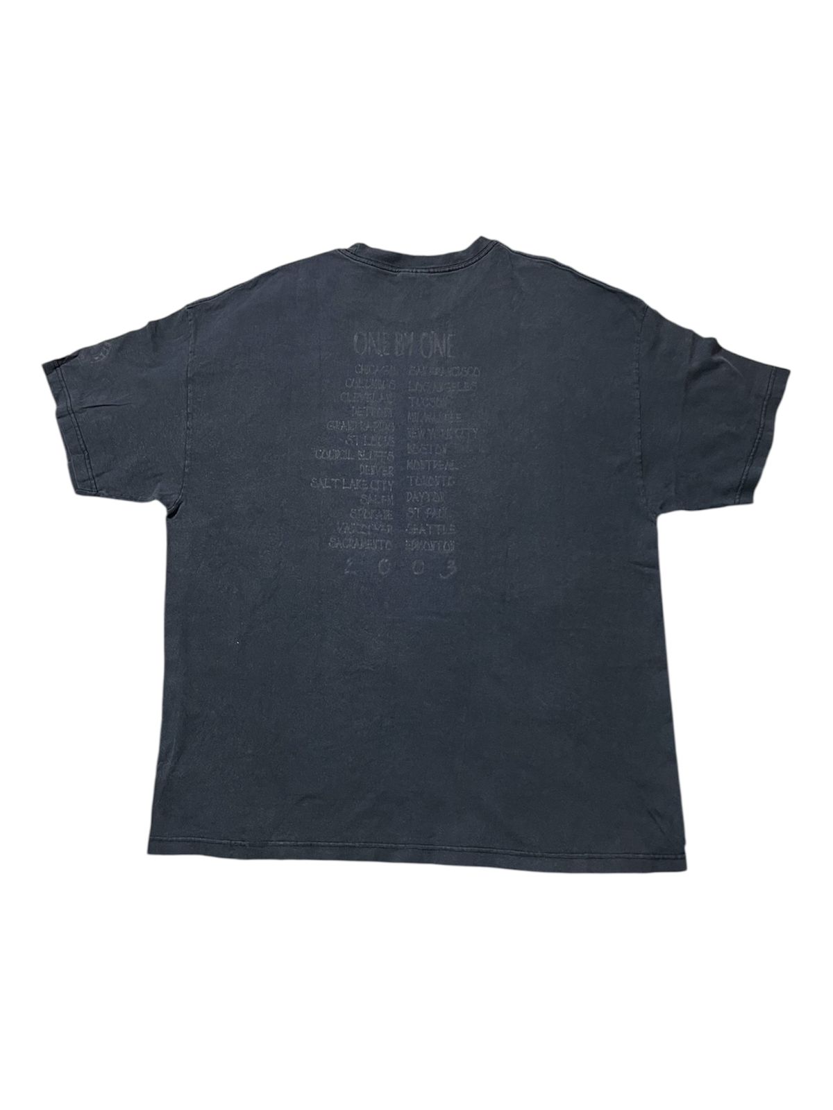 The vintage Foo Fighters One By One Tour 2003 T-shirt represents the band’s successful but hard-fought return to form after a period of intense internal turmoil that nearly led to their breakup. The album One By One, released in October 2002, was born from famously difficult and scrapped recording sessions marked by escalating tensions, especially between Dave Grohl and Taylor Hawkins, an ordeal that led Grohl to temporarily drum for Queens of the Stone Age. However, the band ultimately reunited, quickly re-recording the album’s core tracks—including hits like the Grammy-winning “All My Life” and the anthemic “Times Like These”—to capture the aggressive, raw energy of their live show. The 2003 tour, commemorated on the back of this shirt with its North American dates, was a massive stadium-filling trek that ultimately cemented the band’s longevity and unity, proving they had successfully navigated their crisis and were ready to embrace their status as rock headliners.