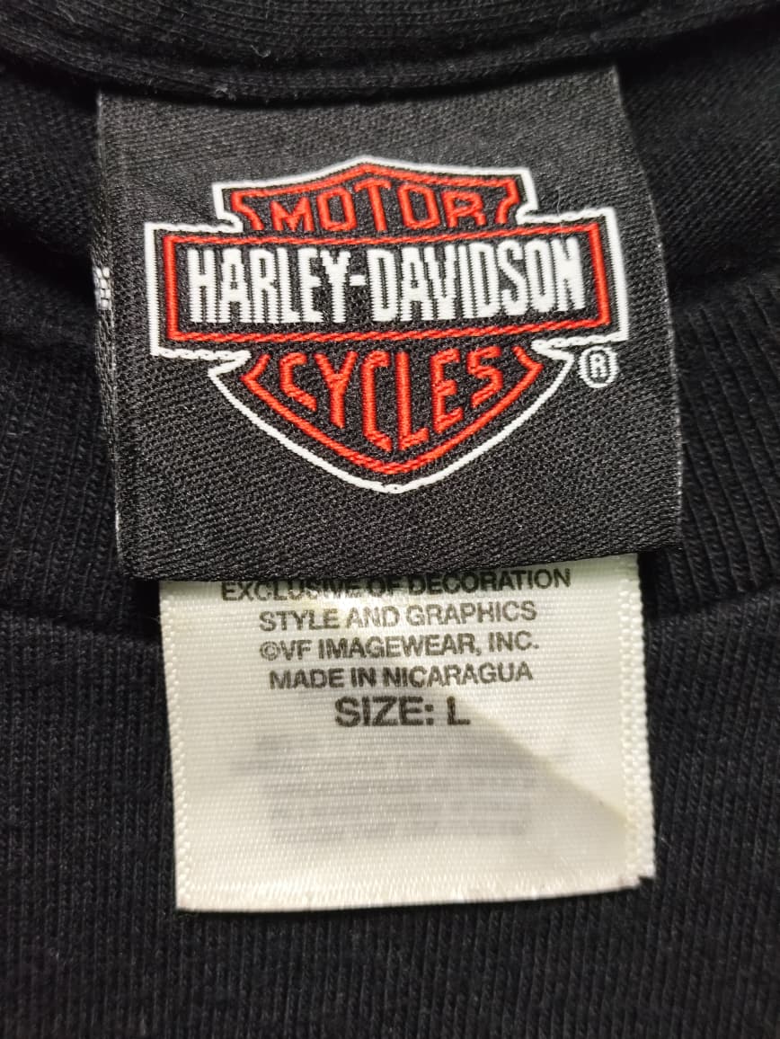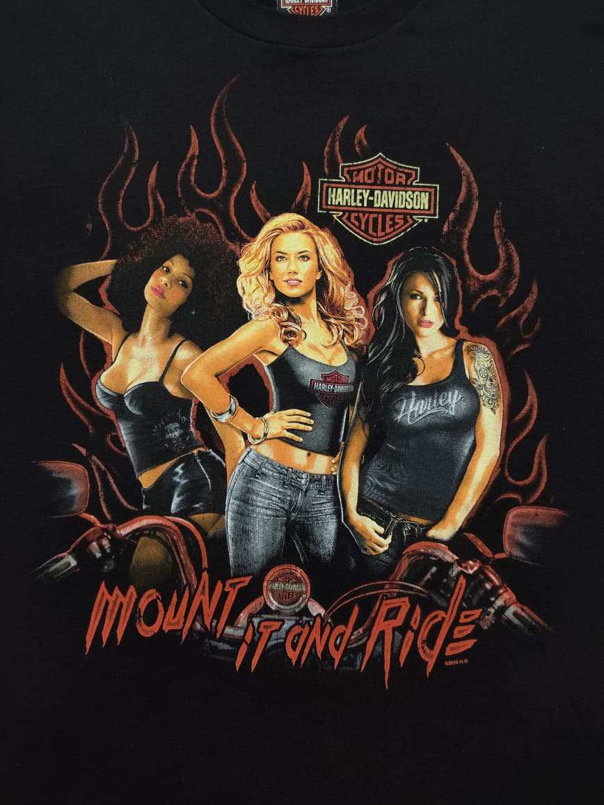 This vintage Harley-Davidson “Mount It And Ride” t-shirt is a bold example of the brand’s marketing that often intertwined the thrill of riding with a more suggestive, edgy aesthetic. The front graphic, featuring three women in a style reminiscent of pin-up art or alternative culture, along with the “Mount It And Ride” slogan, clearly appeals to a specific segment of the Harley-Davidson demographic that embraces a rebellious and liberated lifestyle. The back, however, grounds the shirt in a specific location: “Bluegrass Harley-Davidson, Louisville, KY,” indicating it was likely sold at this dealership. This combination highlights how even with more provocative designs, Harley-Davidson merchandise often serves as a souvenir or statement piece connecting riders to specific communities and their shared passion for the open road.