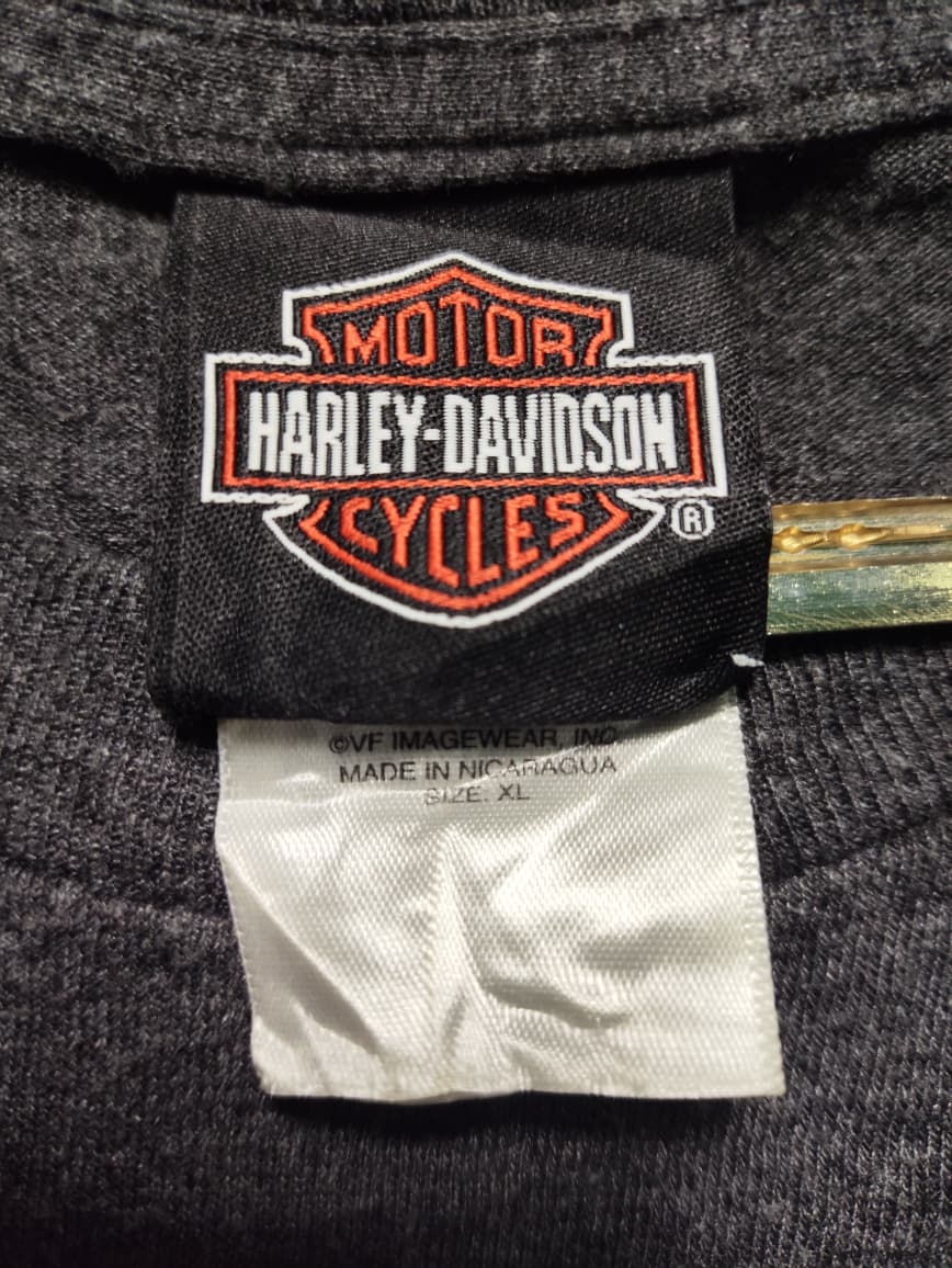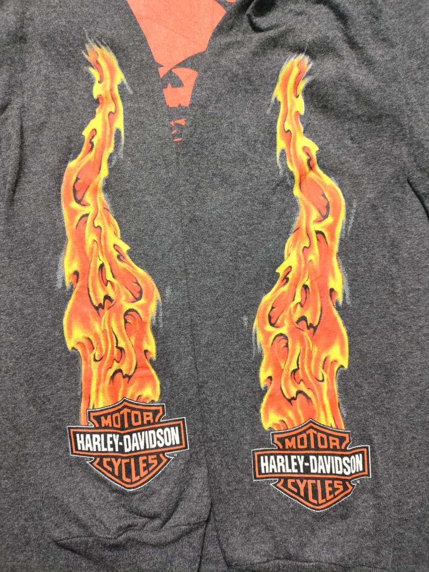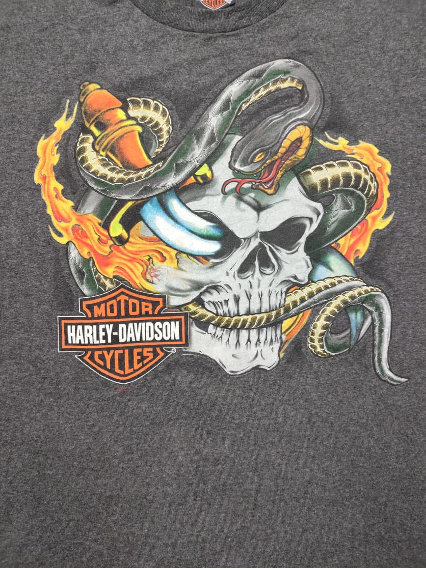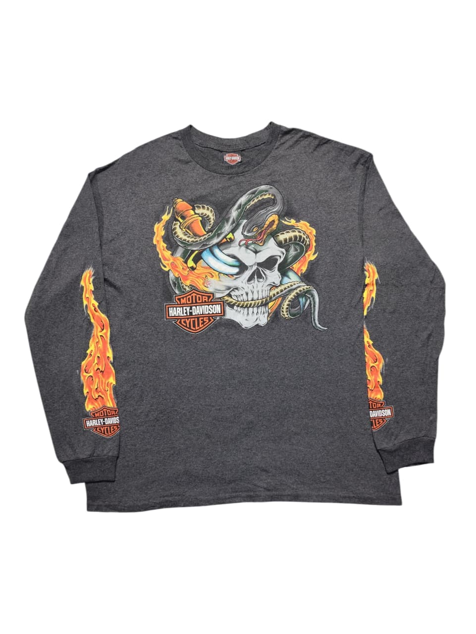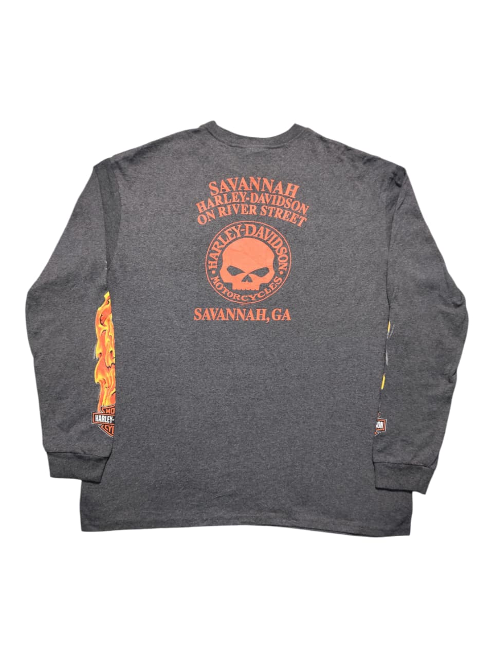 This vintage Harley-Davidson long-sleeve shirt is a striking piece of regional memorabilia, specifically from “Savannah Harley-Davidson on River Street” in Savannah, Georgia. Dealership-specific apparel like this helps foster a strong sense of community and pride among local riders and visitors alike. The shirt’s design, featuring a prominent skull and snake motif engulfed in flames on the front, flames down the sleeves, and the dealership’s full name and location on the back with another skull graphic, embodies the classic rebellious and bold spirit associated with Harley-Davidson while serving as a tangible memento of a visit to this historic city and its connection to the iconic brand.