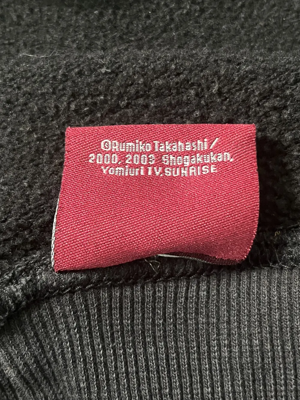 Inuyasha hoodie is a significant piece of anime memorabilia from the early 2000s, specifically licensed during the height of the series’ global popularity. The front features a striking silhouette of the half-demon protagonist, Inuyasha, wielding his iconic sword, the Tessaiga, set against a large, stylized sun—a design that captures the action-packed and supernatural essence of Rumiko Takahashi’s epic series. Authentic details on the garment include a red woven “InuYasha” brand tag and a secondary tag clearly crediting the original creator, Rumiko Takahashi, along with the major production entities Shogakukan, Yomiuri TV, and SUNRISE. Dated 2000 and 2003, these production markers align with the original broadcast window and the expansion of official merchandise into the Western market via brands like Custom Sport Gear, which manufactured this specific piece in Vietnam.