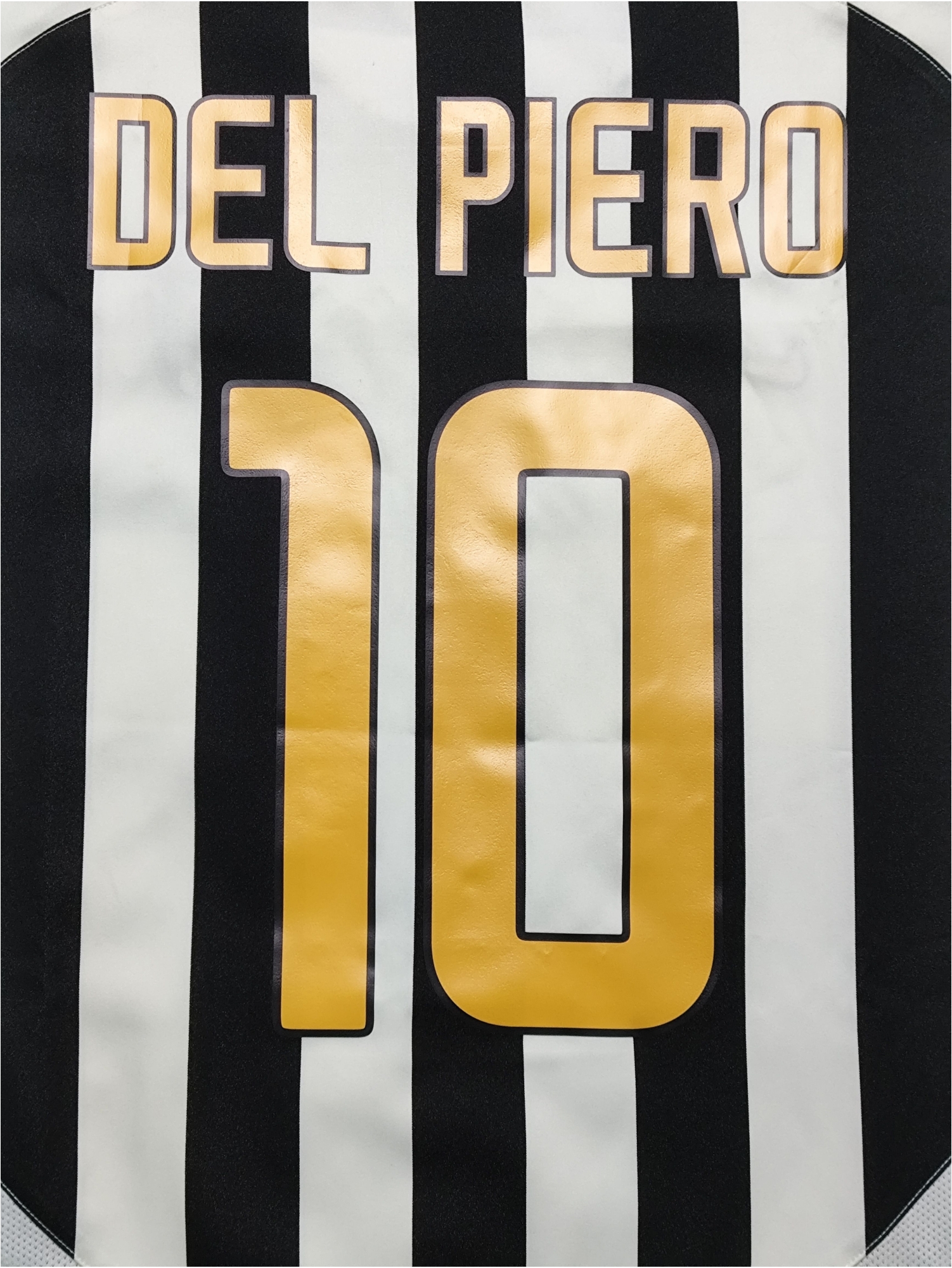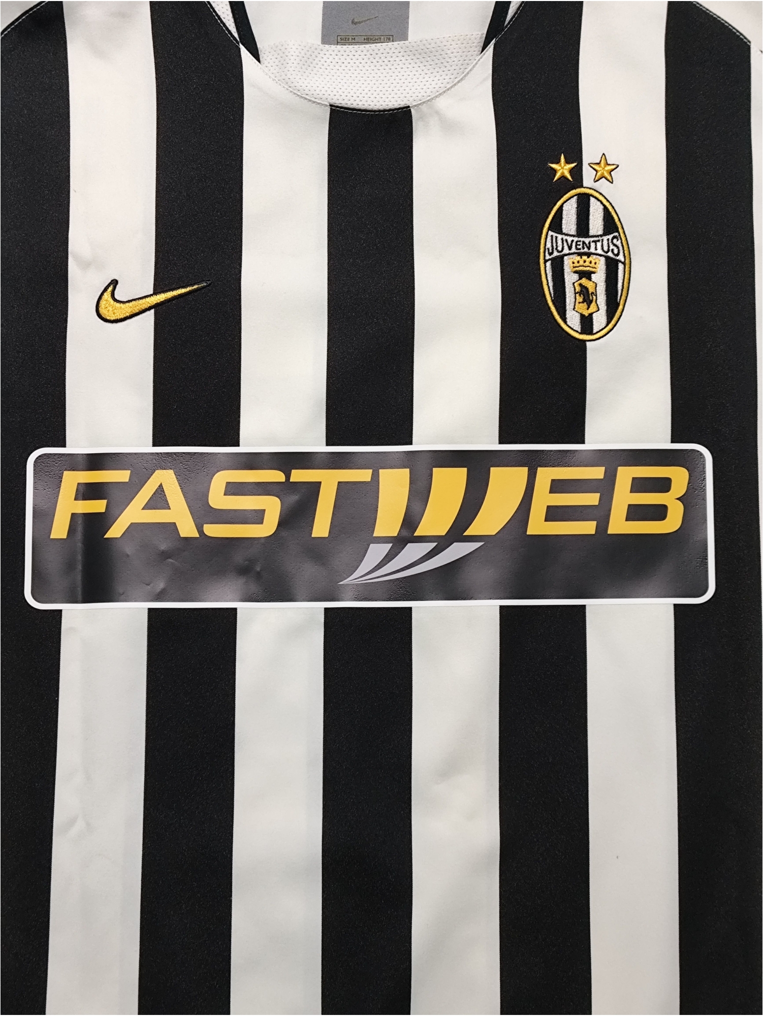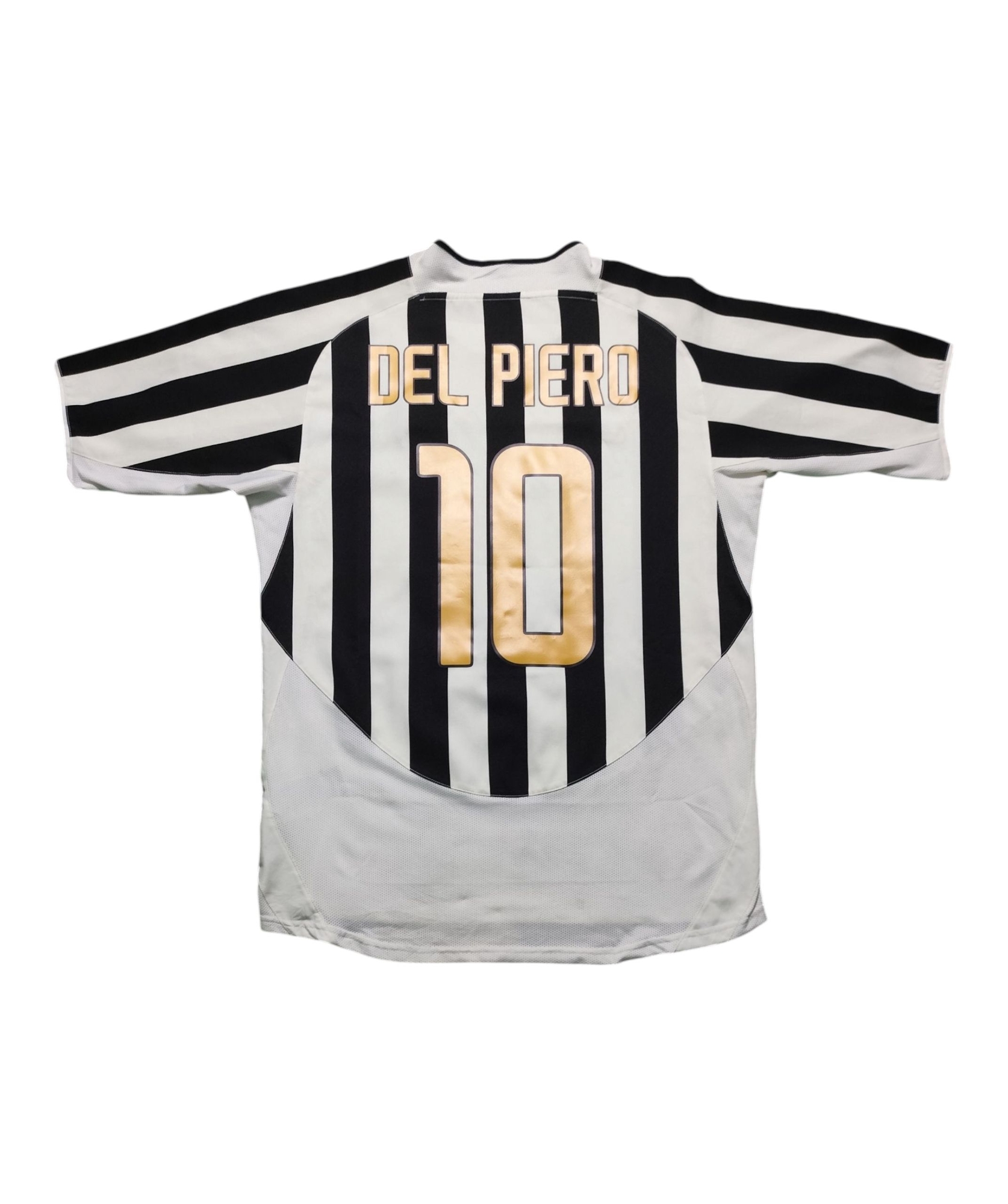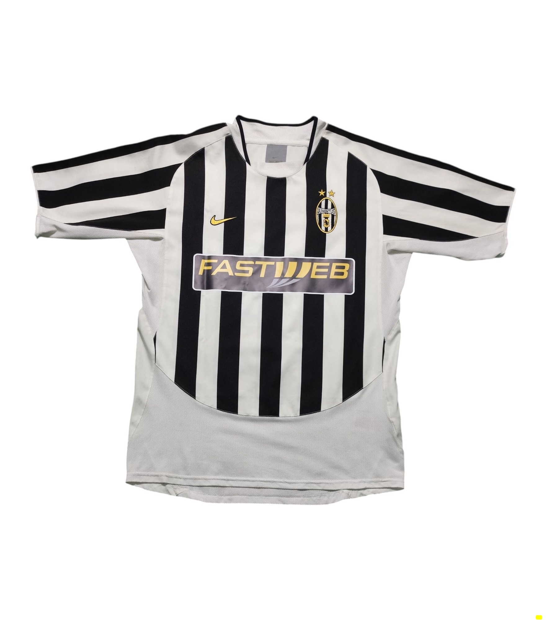 This vintage Nike Juventus home jersey from the 2003-04 season, emblazoned with Alessandro Del Piero’s legendary number 10 and the “Fastweb” sponsor, marks a challenging yet significant period for the Bianconeri. Having won the Scudetto in the previous two seasons, Juventus, under Marcello Lippi, aimed for continued success. However, despite a strong start and winning the Supercoppa Italiana, they ultimately finished third in Serie A, conceding a high number of goals, and were surprisingly eliminated in the Round of 16 of the Champions League by Deportivo La Coruña. This iconic black and white striped kit was worn by a star-studded squad featuring players like Gianluigi Buffon, Pavel Nedvěd, Edgar Davids (who later left on loan), and David Trezeguet, representing a season that, while not reaching the pinnacle of previous years, still showcased the club’s enduring legacy and the brilliance of its individual talents.