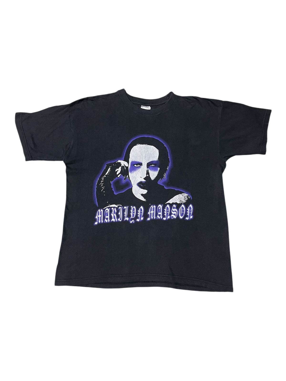 This vintage Marilyn Manson T-shirt, with its distinctive purple-and-black color scheme, is a classic piece of merchandise from the height of the band’s fame in the late 1990s. The shirt’s design features a stylized, almost haunting, portrait of Marilyn Manson, and the visual style is emblematic of the era of his albums Antichrist Superstar and Mechanical Animals. During this time, Manson was one of the most controversial figures in music, and his visual identity—a mix of glam rock, goth, and industrial aesthetics—was as crucial to his brand as his music. The shirt itself, printed on an “American T-Shirt” tag, is a sign of the mass-market production that accompanied the band’s rise to mainstream recognition. It’s a relic of a time when the band’s provocative style and shock-rock persona were at their peak, making it a highly collectible item that represents a key moment in the history of alternative music.