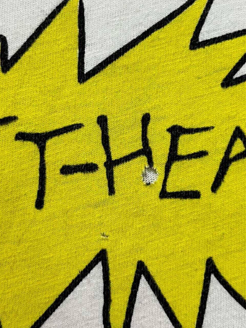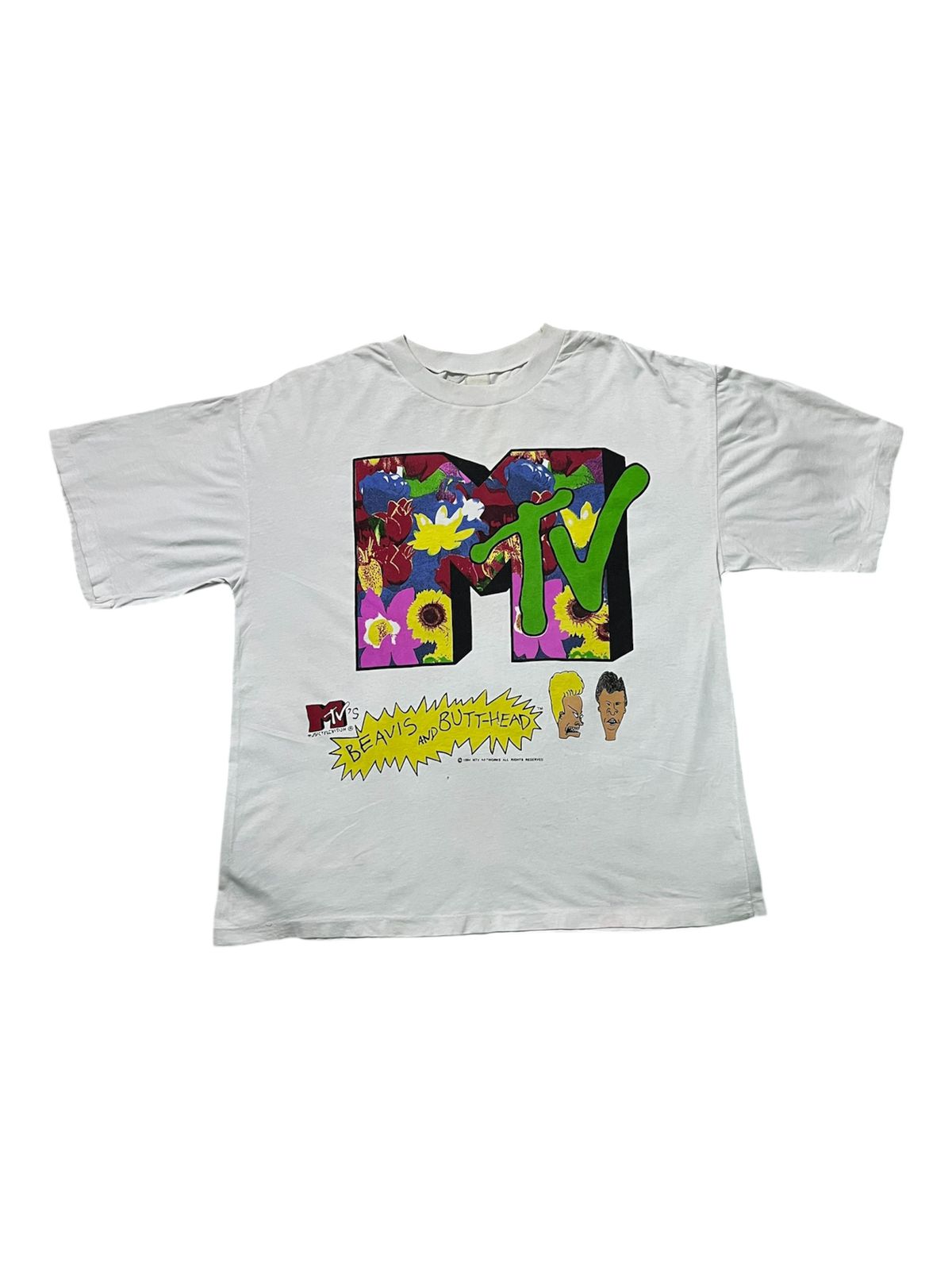 The vintage MTV Beavis and Butt-Head T-shirt from 1994 is a potent artifact from the peak of the show’s initial cultural dominance, when the crudely animated duo became the unlikely, sniggering anti-heroes of Generation X. Having debuted in 1993, the show quickly became MTV’s top-rated program, and 1994 was the year the franchise cemented its status as a pop culture phenomenon that critics either adored for its satirical commentary on society or condemned for its vulgarity. This specific shirt, featuring the iconic Beavis and Butt-Head characters beneath a large, psychedelic, floral-filled MTV logo, is a rare piece of original merchandise that directly connects the show to the channel that popularized it, representing a time when the gap between “high” and “low” culture was being gleefully decimated by Mike Judge’s simple, iconic animation and the delinquents’ unforgettable catchphrases, “Huh huh,” and, “Fire! Fire!”