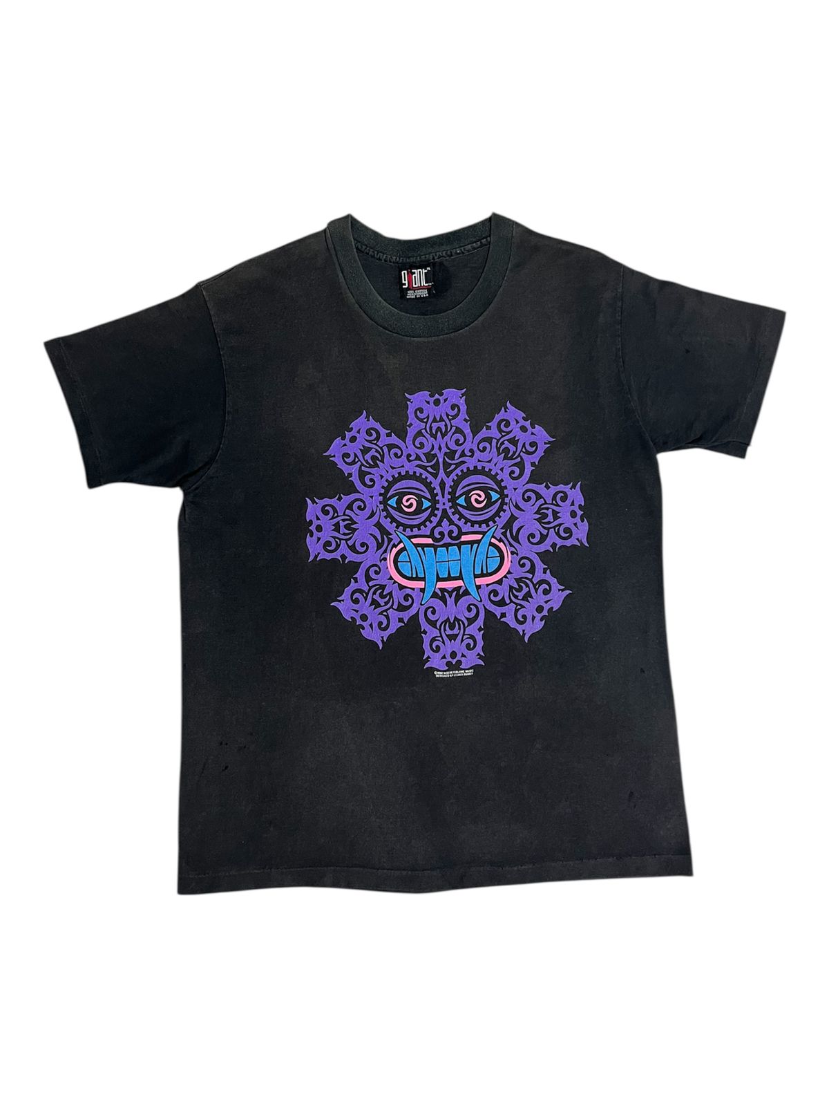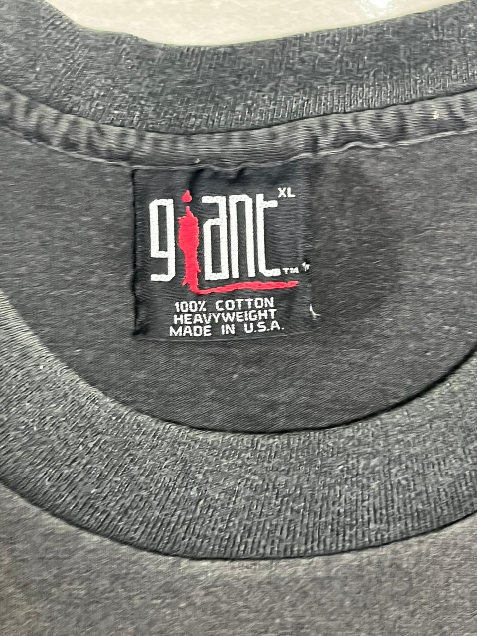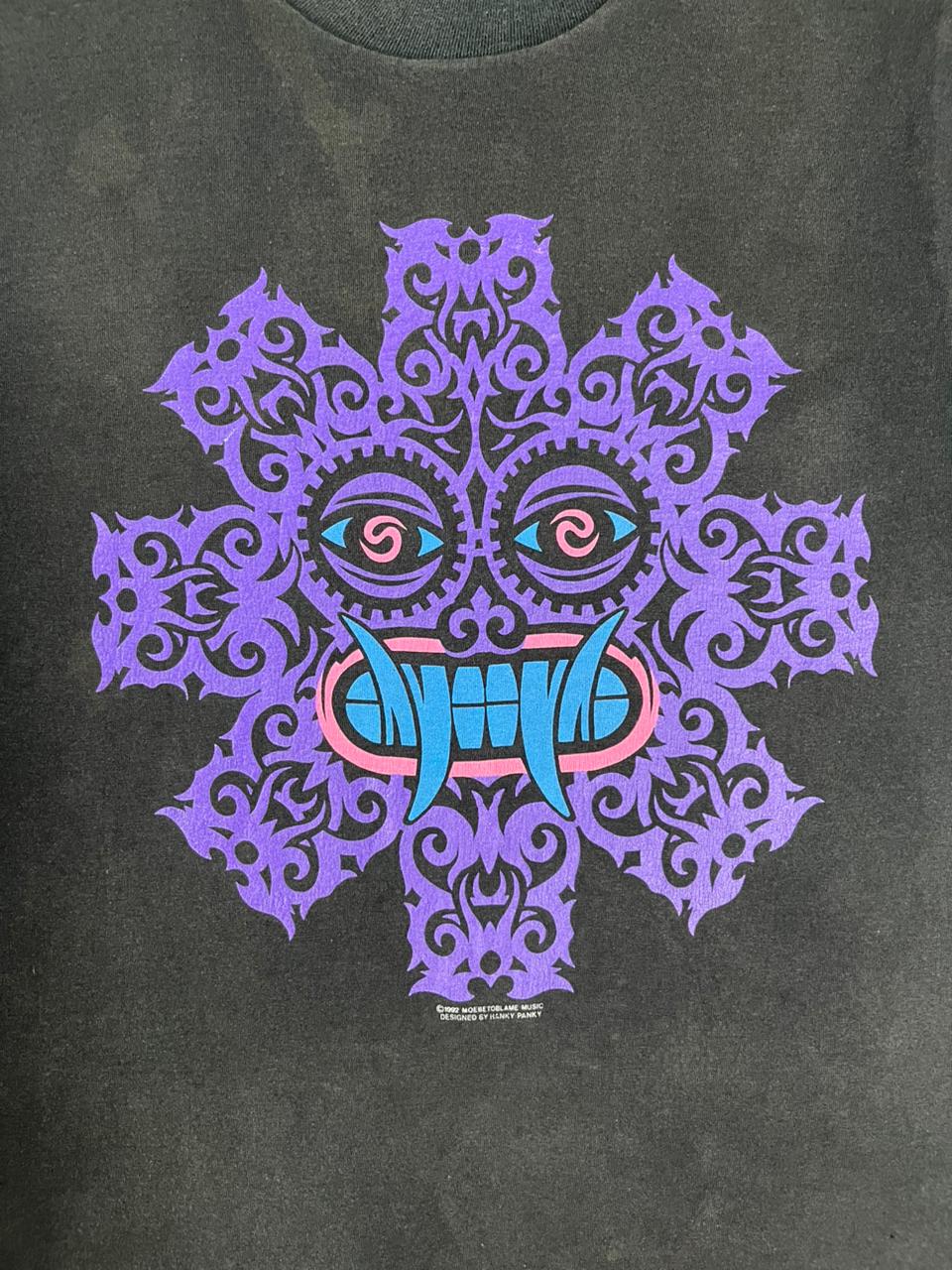 This rare vintage 1992 Red Hot Chili Peppers shirt is a iconic relic from the band’s commercial peak following the massive success of their album Blood Sugar Sex Magik. The front graphic features a stylized, tribal-influenced face centered within the band’s signature eight-pronged asterisk, a symbol originally sketched on a whim by frontman Anthony Kiedis in 1984 after record executives requested a logo. While officially known as the “Star of Affinity” to represent chaos and the various paths one may take in life, Kiedis has famously and more irreverently nicknamed the design “Angel’s A–hole“. This specific 1992 design was a staple of the merchandise sold during the band’s headlining slot on the second Lollapalooza festival, where they performed alongside other 90s giants like Pearl Jam and Soundgarden. Printed on a classic Giant tag—a brand that dominated the high-quality concert merchandise market in the early 90s—this shirt is a highly prized “grail” for collectors, representing the definitive era of the “funk-punk” pioneers.