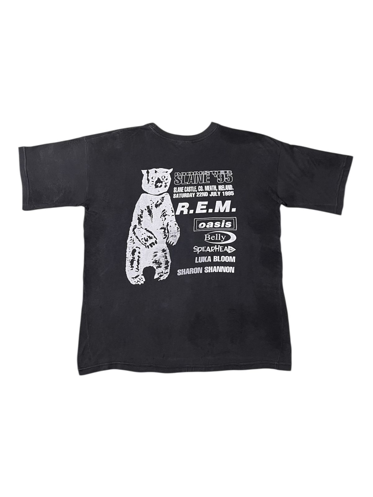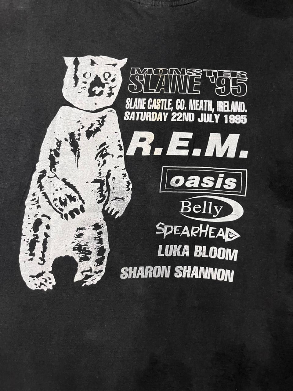 This vintage R.E.M. Monster 1995 t-shirt commemorates a legendary and historically turbulent moment in the band’s career, specifically their headlining performance at Slane Castle in Ireland on Saturday, July 22nd, 1995. The show was a triumphant return to the stage following a string of health crises that earned the Monster world tour a “cursed” reputation; it was the band’s first concert after bassist Mike Mills underwent emergency surgery for an intestinal tumor, and it followed drummer Bill Berry’s life-threatening brain aneurysm earlier that year. The back of your shirt features an incredible supporting lineup that includes a young Oasis—who performed just months before releasing Morning Glory—alongside Belly, Spearhead, Luka Bloom, and Sharon Shannon. Because this tour marked the final time the original four members toured together before Berry’s retirement in 1997, and because the Slane Castle show is remembered for its electric atmosphere and near-cancellation, this specific “Slane ’95” bear graphic has become one of the most iconic and sought-after pieces of 90s alternative rock memorabilia.