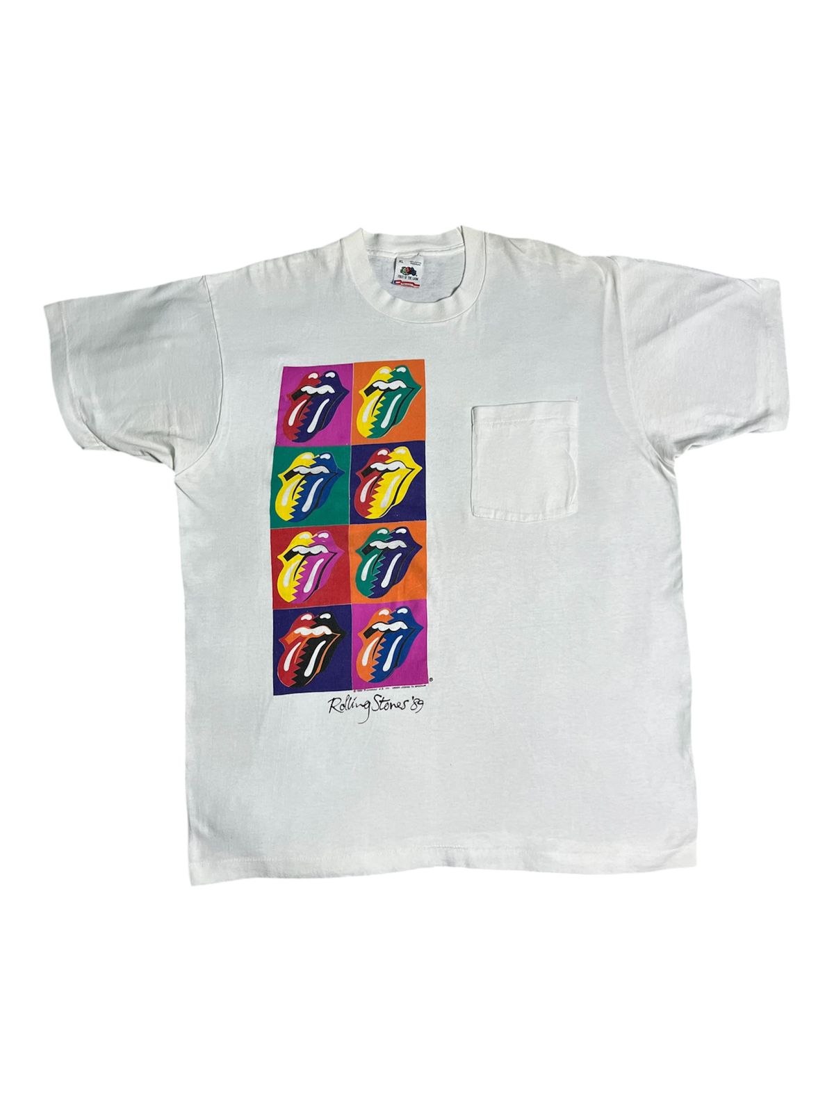 This rare vintage 1989 Rolling Stones pocket t-shirt was released to commemorate the band’s massive Steel Wheels North American Tour, which marked their triumphant return to the stage after a seven-year hiatus. The iconic “nine tongues” graphic is a celebrated piece of rock merchandise history, featuring a pop-art reimagining of the classic 1970 John Pasche logo in a style heavily inspired by the vibrant, multi-colored aesthetic of Andy Warhol. This specific tour was a historic milestone for the band, grossing over $175 million and serving as the final live outing for founding bassist Bill Wyman, who departed the group shortly after the tour concluded in 1990. Produced on a Fruit of the Loom blank, this pocket tee is highly prized by collectors for its unique “corporate-meets-counterculture” design and its connection to the tour that birthed modern stadium-rock spectacle, complete with giant inflatables and elaborate pyrotechnics.