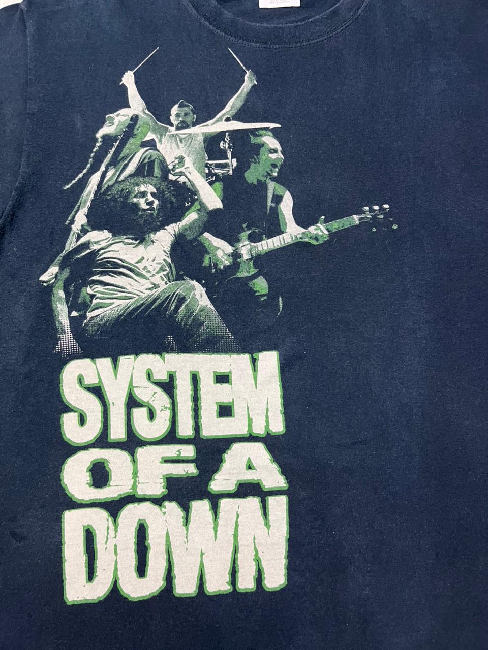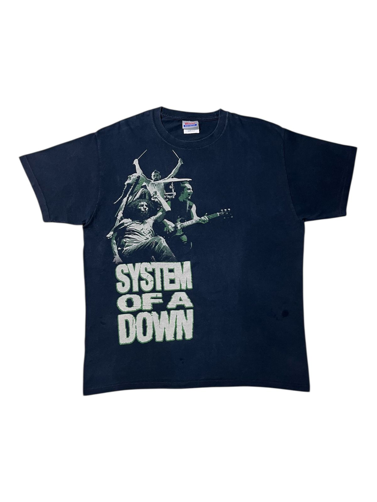 This vintage System Of A Down t-shirt is a classic piece of nu-metal memorabilia from the band’s peak era in the early 2000s. Featuring a high-energy live photo of the original lineup—Serj Tankian, Daron Malakian, Shavo Odadjian, and John Dolmayan—the graphic captures the explosive stage presence that defined their breakthrough following the 2001 release of the multi-platinum album Toxicity. The shirt is printed on a Hanes Heavyweight tag, a common blank used for licensed concert merchandise during the late 90s and early 2000s. This specific design, with its bold green typography, was a staple of the merchandise sold during their massive global tours between 2001 and 2003, a period when the band solidified their legacy as politically charged titans of alternative metal.