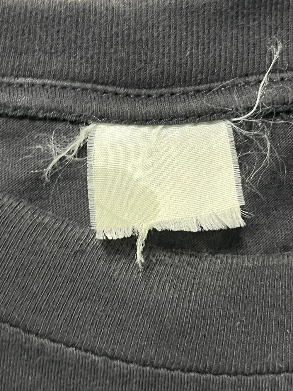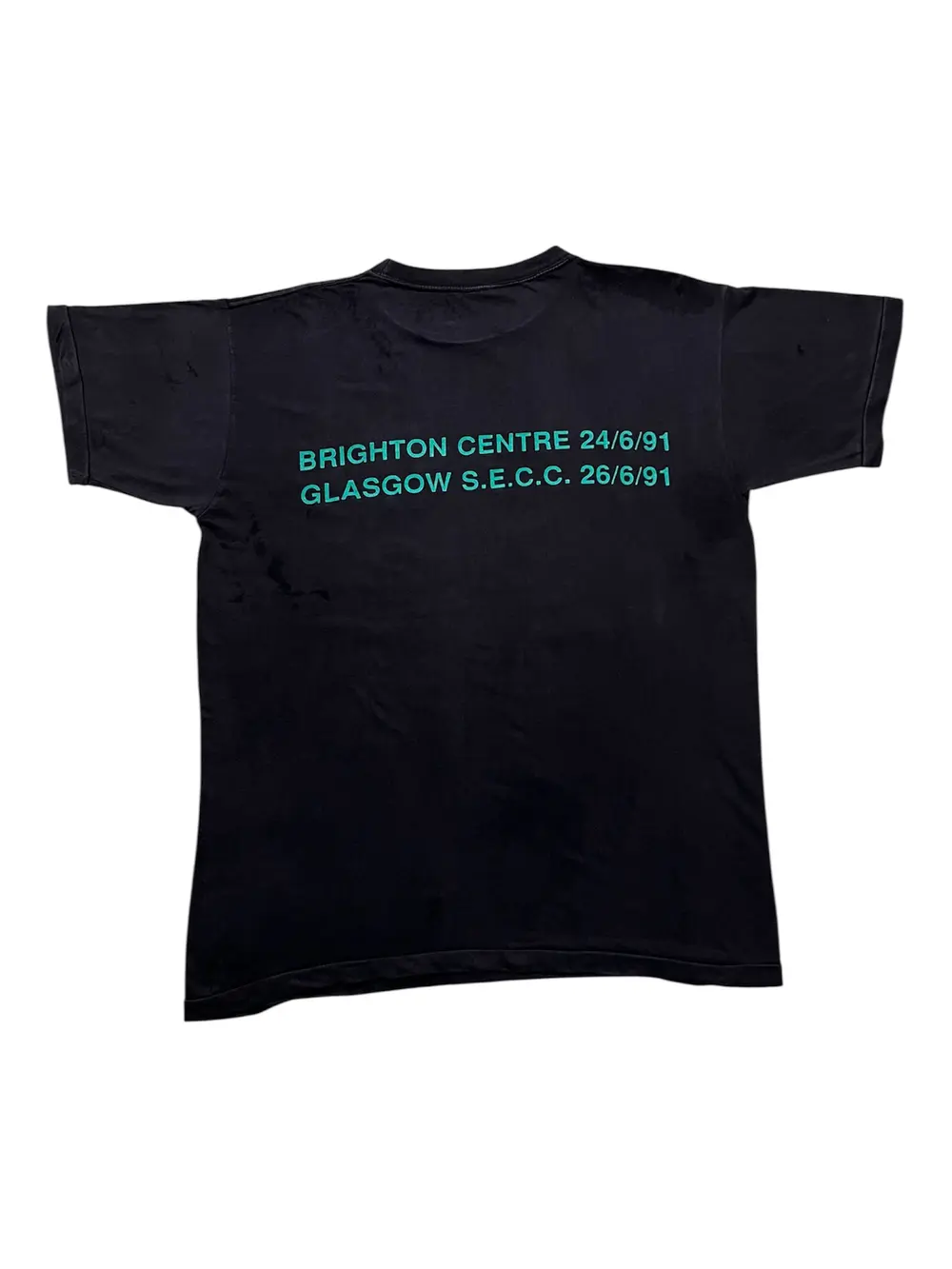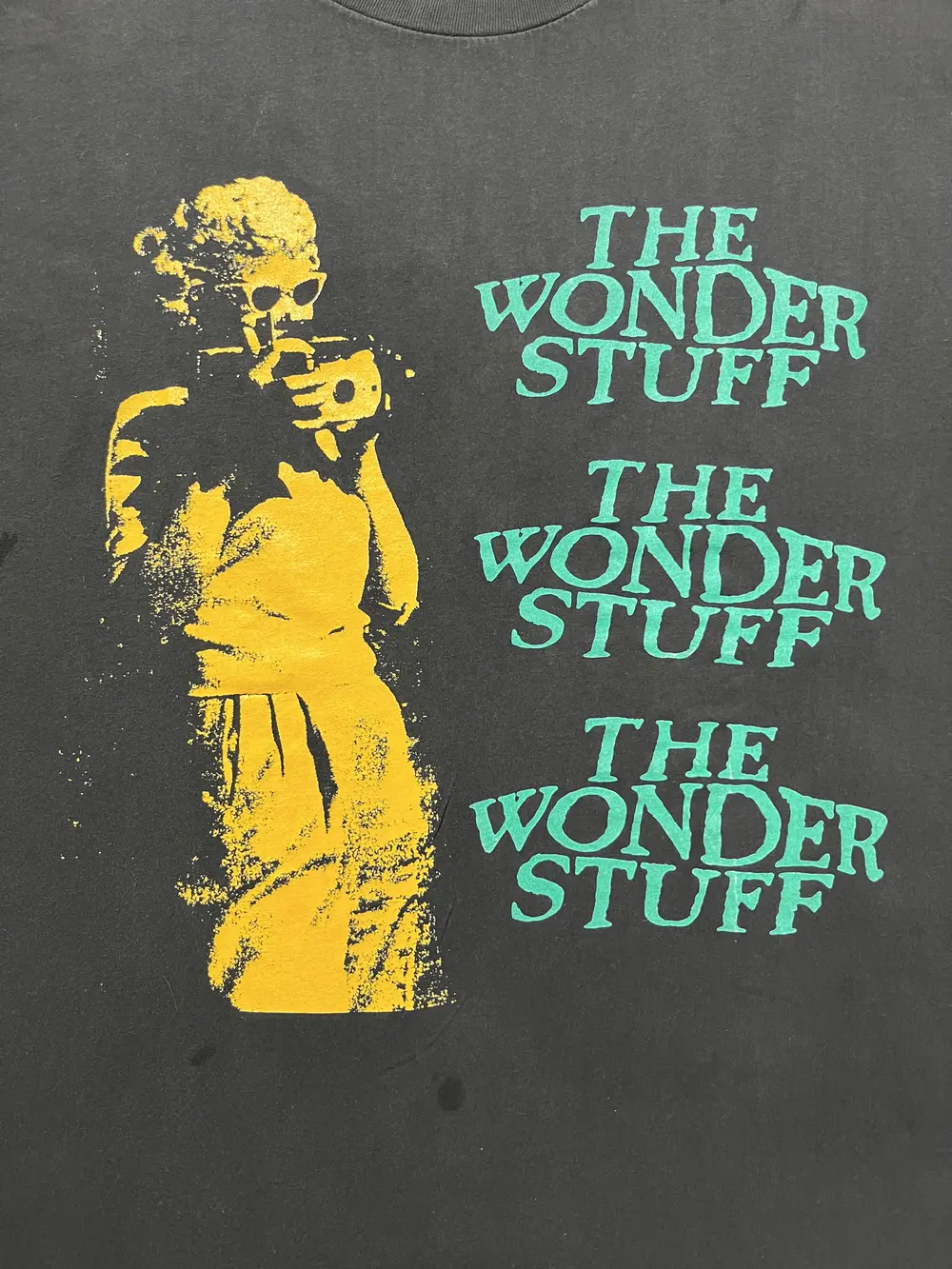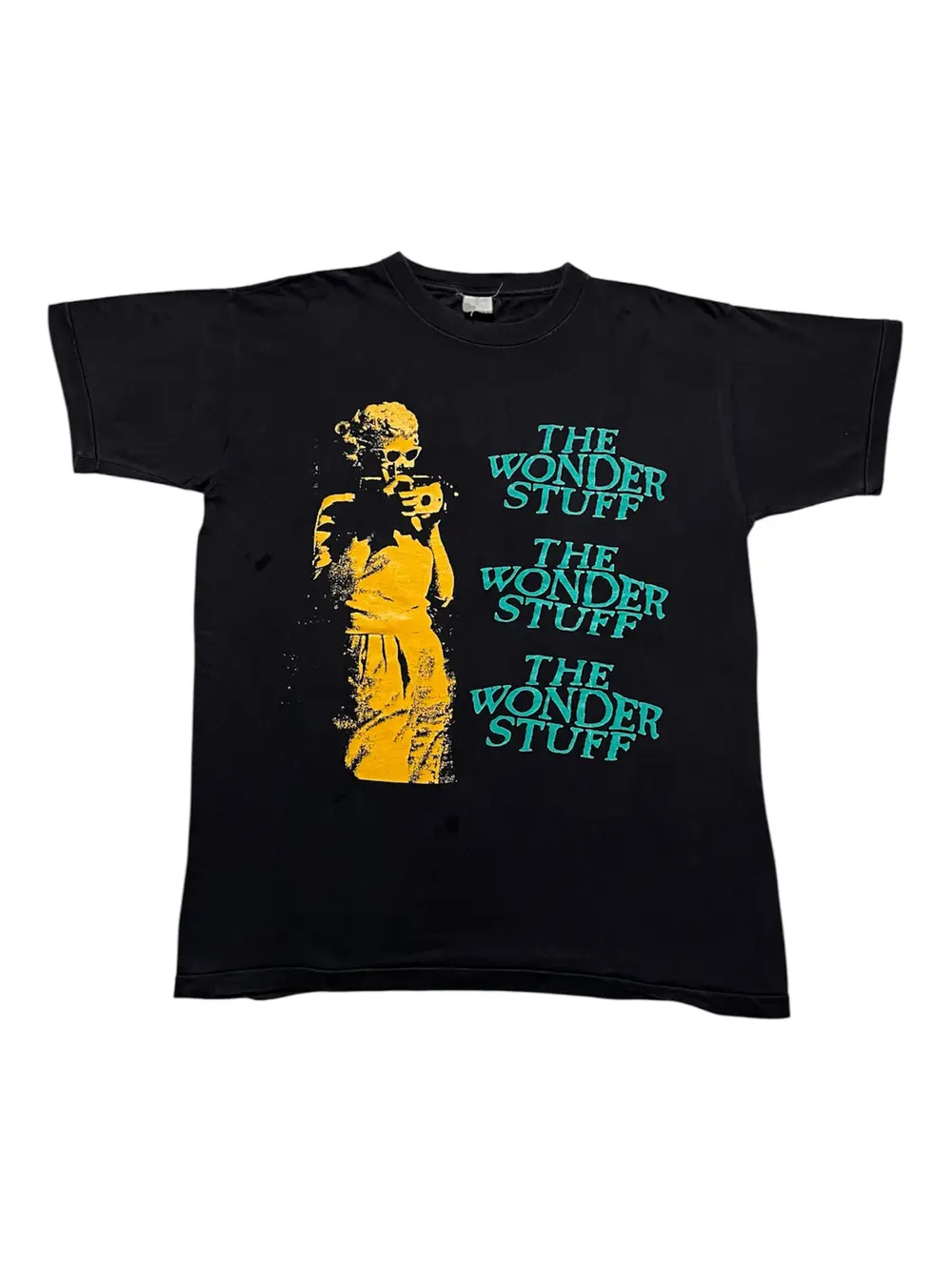 This vintage The Wonder Stuff shirt is a rare piece of memorabilia from the band’s peak “Never Loved Elvis” era in 1991, specifically commemorating their June performances at the Brighton Centre and Glasgow S.E.C.C. The front features a stylized, high-contrast yellow graphic of a figure holding a camera—an aesthetic typical of the early 90s British indie scene—paired with the band’s name in a repeating teal psychedelic font. The back hit clearly dates the garment to June 1991, making it a “tour blank” that serves as a chronological marker for their UK tour that year. Given the era, these were often printed on high-quality European or Screen Stars blanks, and the visible fading and slight cracking on the graphic add to its authentic vintage appeal for collectors of 90s Britpop and alternative rock.
